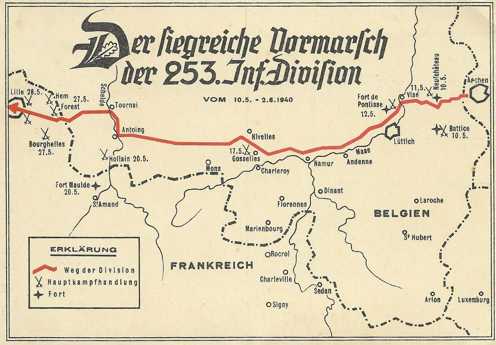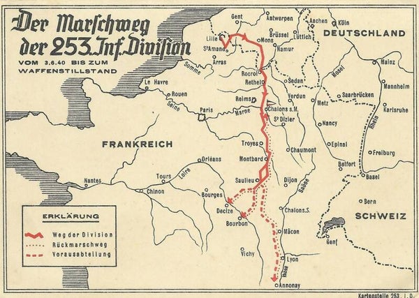 Fine double bright postcard with the route of the DU German soldiers, travelled in May and June 1940 through France, on the reverse.
