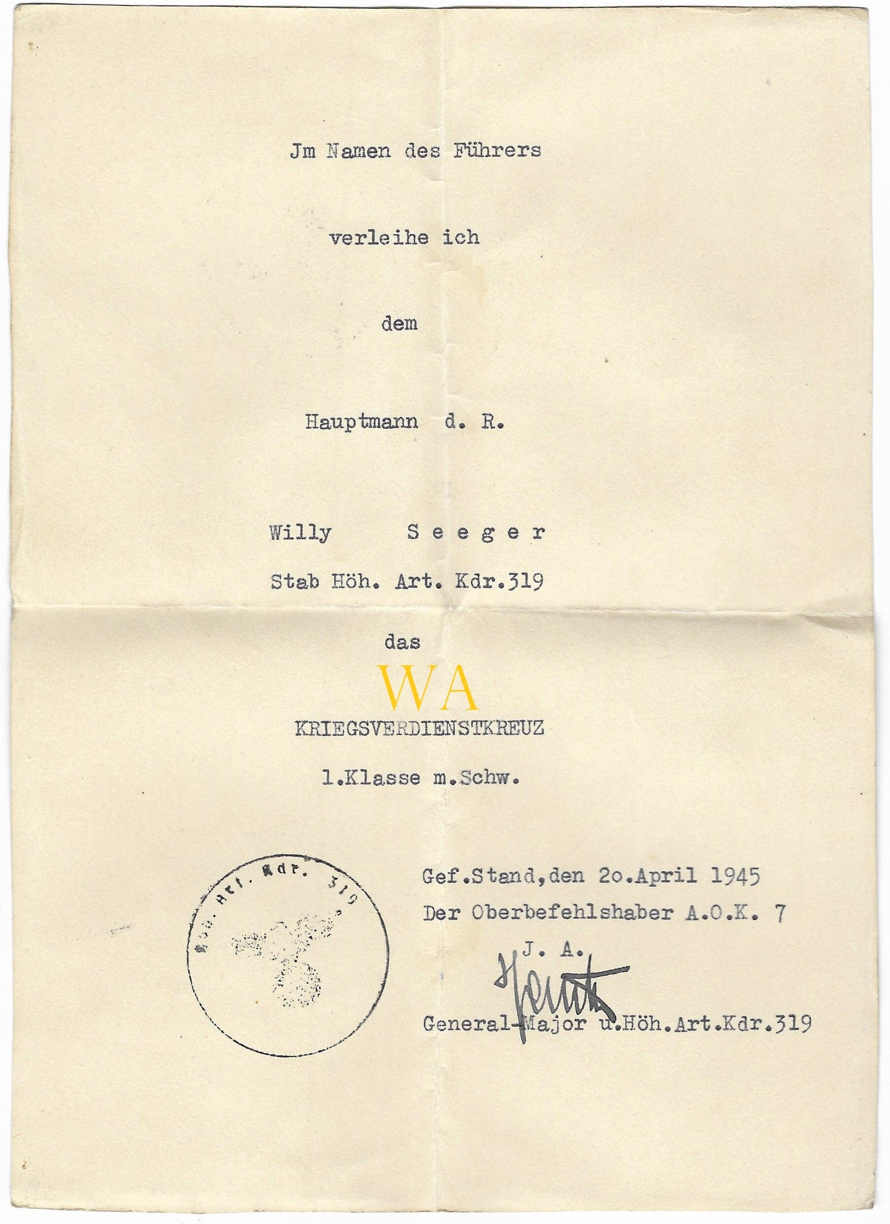 'Kriegs Verdienst Kreuz 1st class with swords' on 20-4-1945