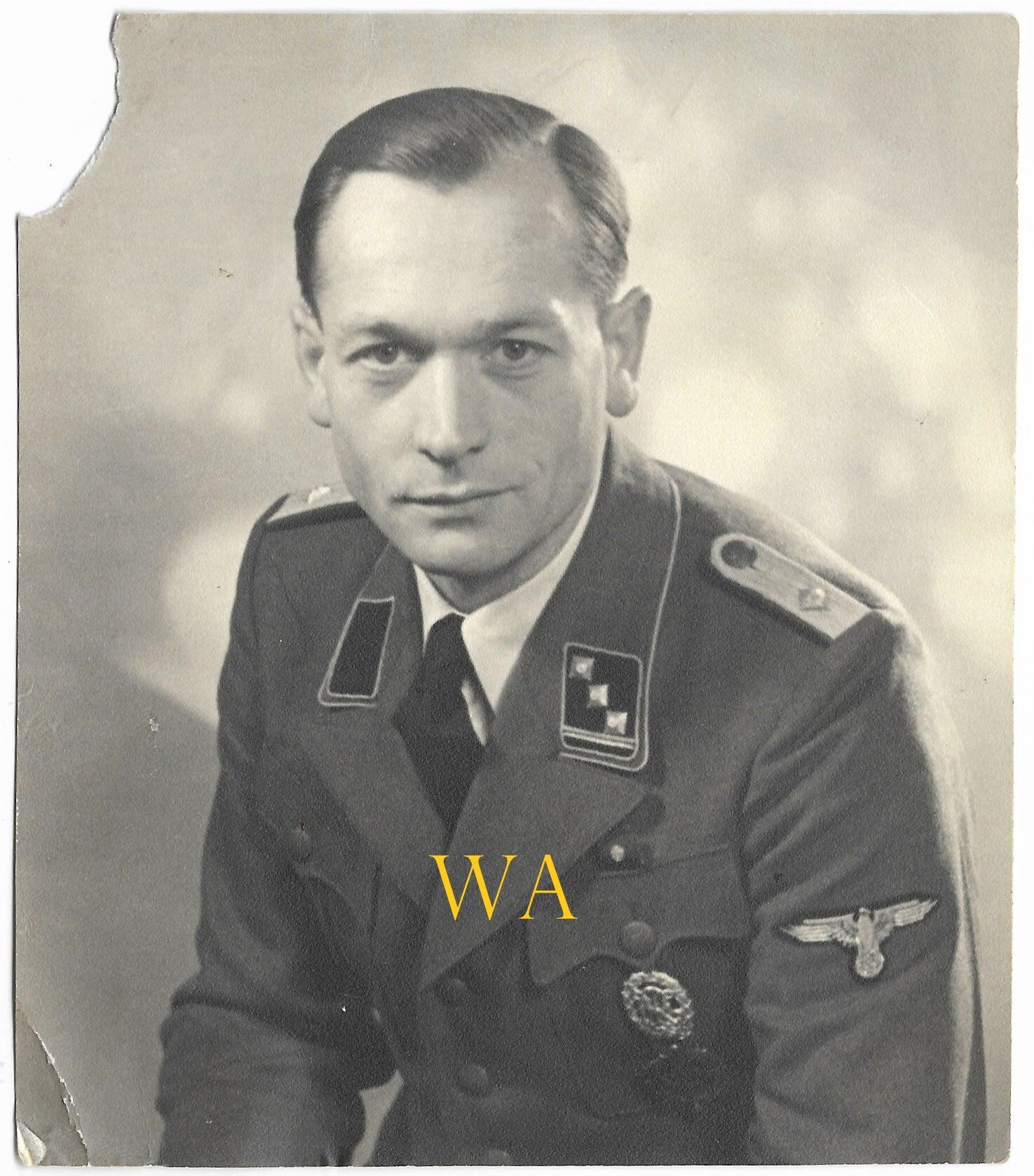 Portrait photo of an SD/Sipo-Obersturmführer. On his chest he wears an SA-Sportabzeichen in bronze and a Reichssportabzeichen in silver.
