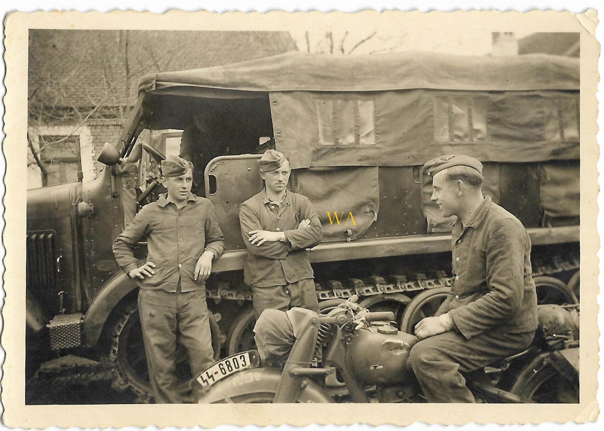 SS soldiers on an SS motorbike and in front of an Sd.Kfz vehicle.