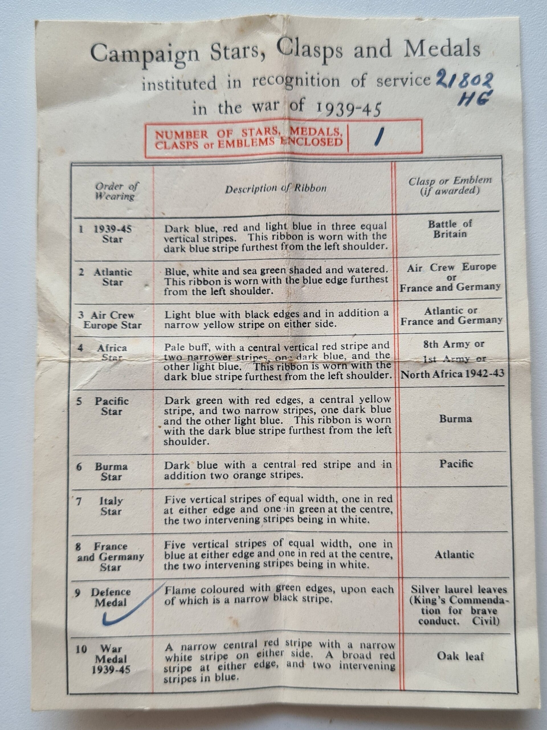 This medal comes complete with the extension box which is named and a document recording all medals from WW2.
