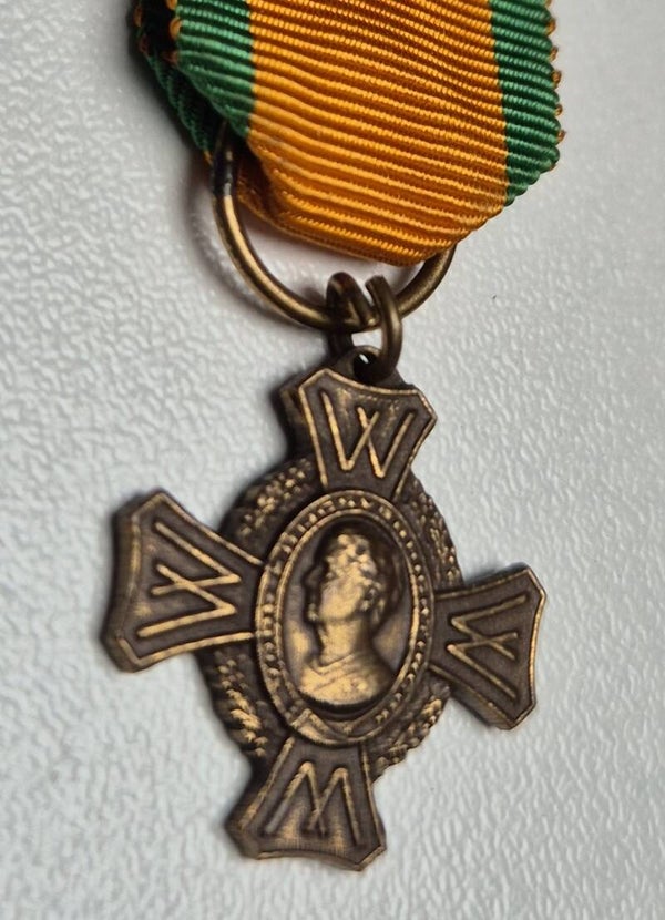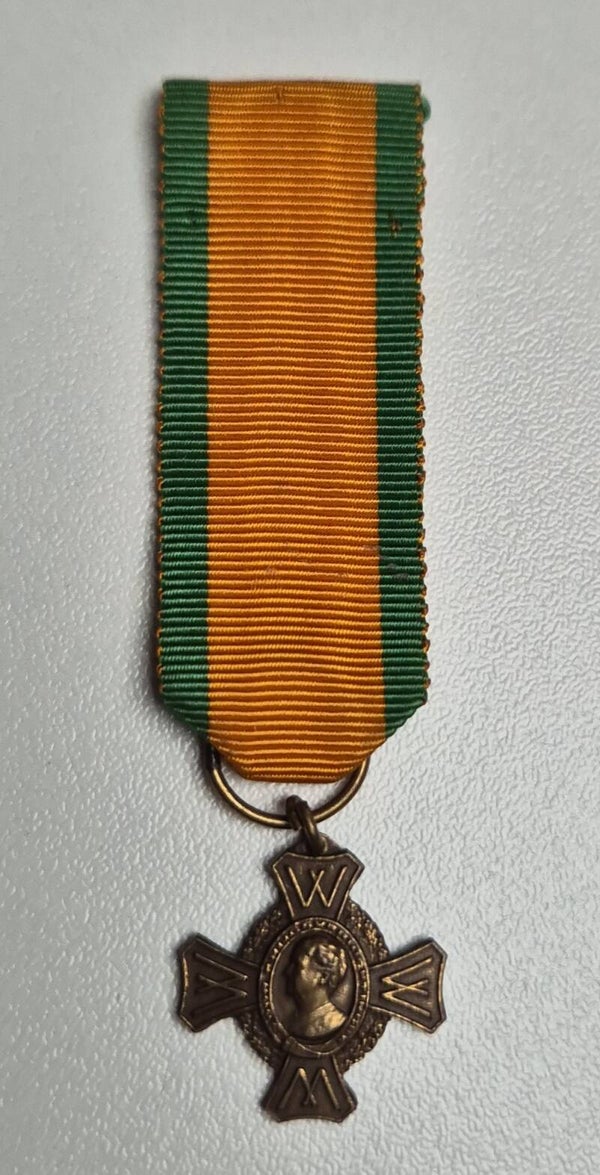 Miniature version measuring 16 x 16mm of the War Remembrance Cross for Warfare Operations in bronze. On the medal is the image of Queen Wilhelmina in oval and four Ws at the ends, marked on the reverse with Kon. Begeer, Voorschoten.Patina is of very good quality considering its age.