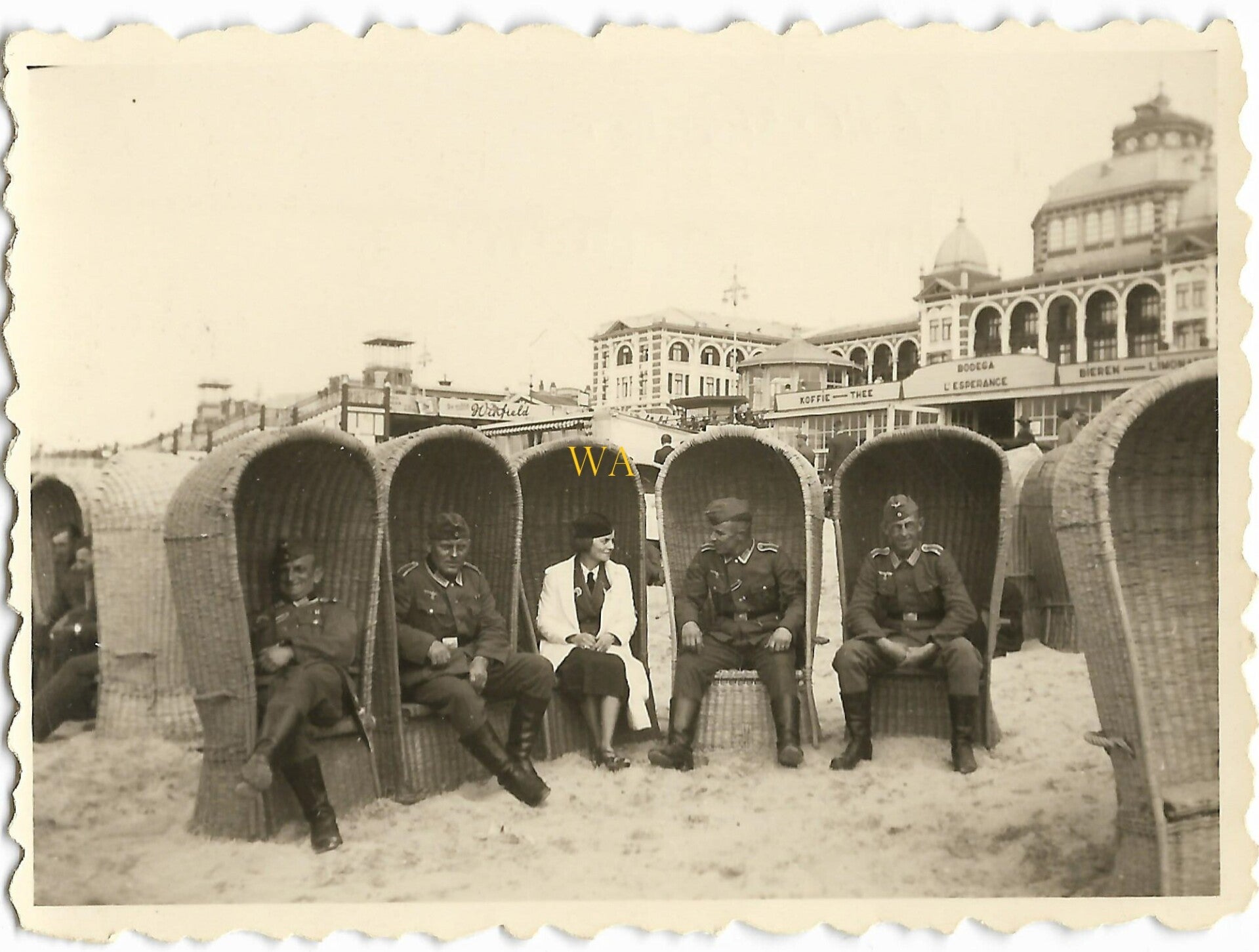 German soldiers and a Helferin in front of the Kuhrhaus in Scheveningen, Holland