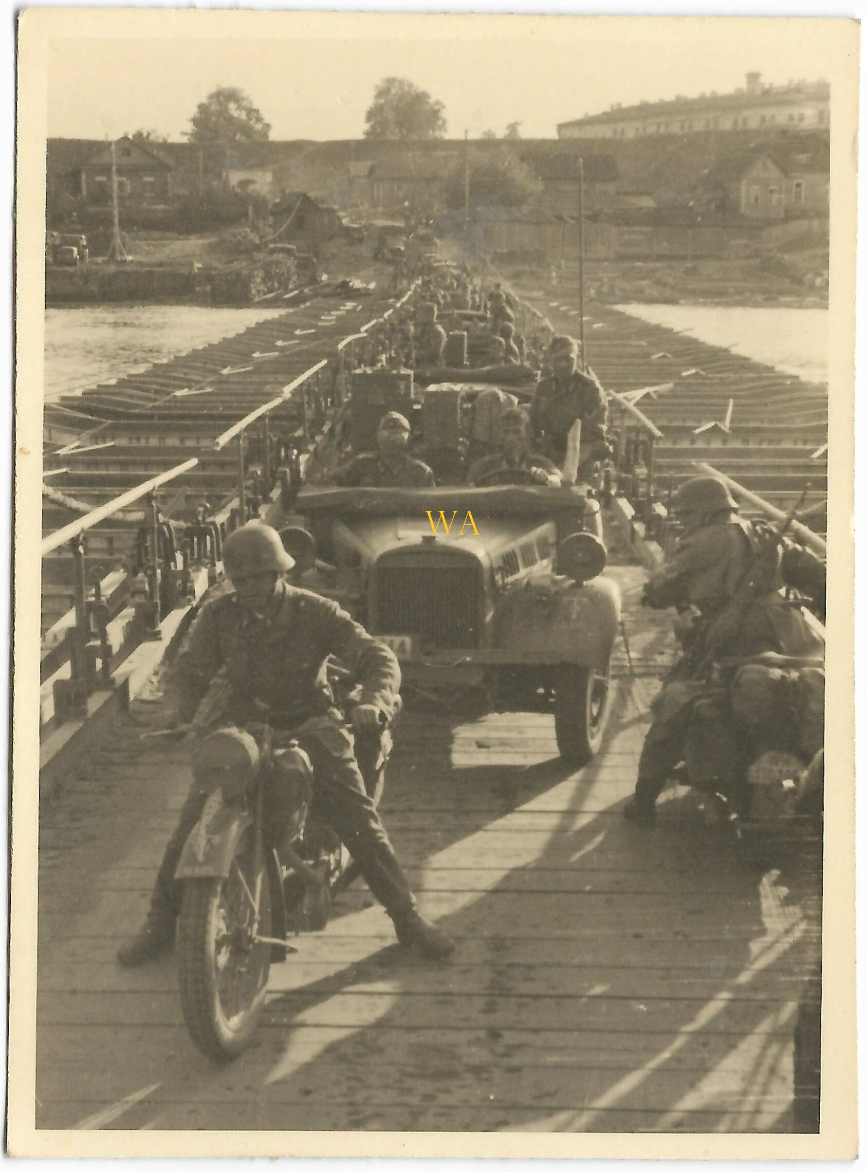 German 'Sonderkraftfahrzeugen' and motorcycles over an emergency bridge