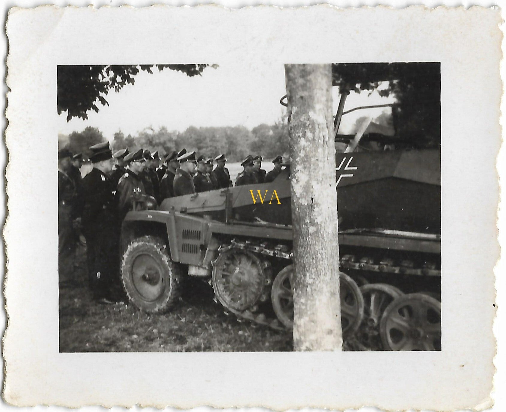 The photo shows many soldiers in panzer uniform and officers. A 'balkenkreuz' can be seen on the side.