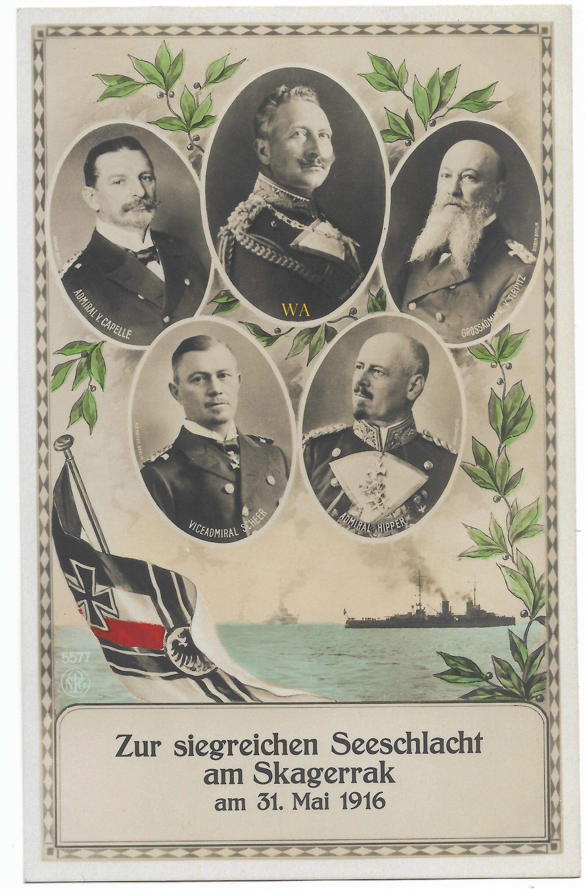 'Die deutsche Propaganda feiert den ‚Sieg am Skagerrak‘. Die Helden sind zusammen mit dem Kaiser abgebildet.'