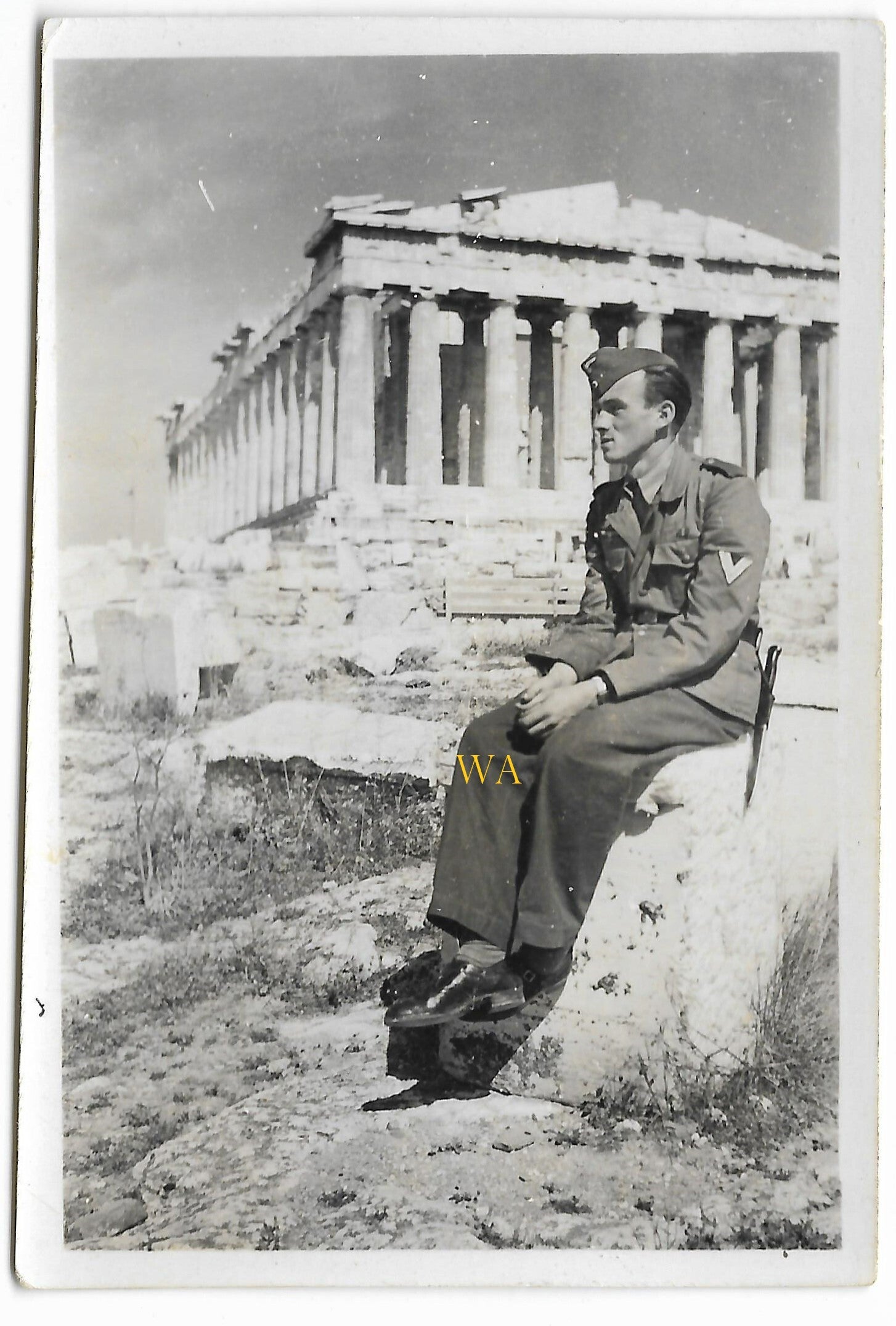 German soldier in front of the Acropolis in Athens, Greece.