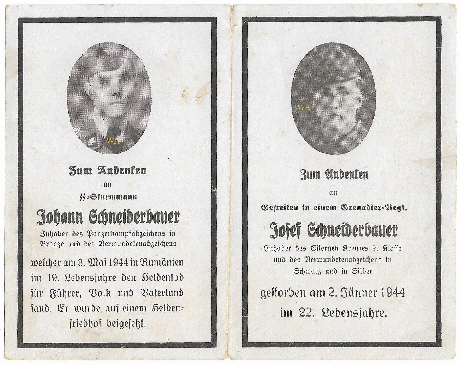 Johann was a bearer of the Panzerkampf abzeichen in Bronze and a bearer of the Verwundetenabzeichen. He died in Romania.